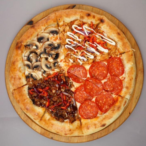 Курица,говядина,соус томатный,шампиньоны,пепперони,колбаски