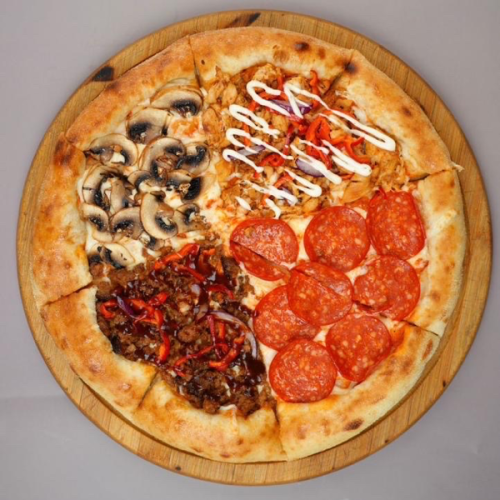 Курица,говядина,соус томатный,шампиньоны,пепперони,колбаски