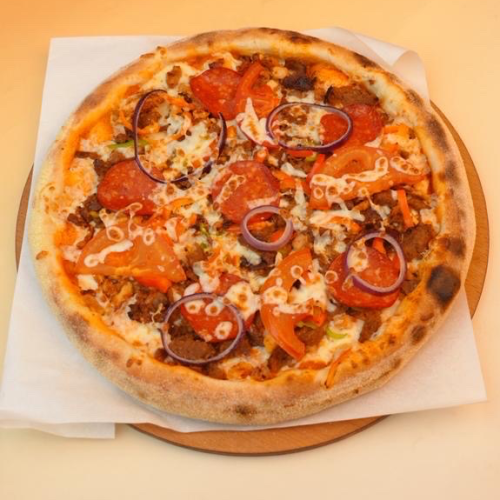 Говядина,курица,соус томатный,перец болгарский,колбаски,пепперони